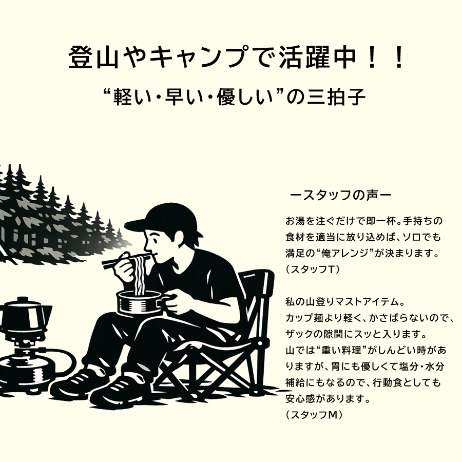 手延べそうめんを、特殊冷熱加工によりノンフライ即席めんに。湯がきたてのもちもち感をお楽しみいただけます。具材やつゆにもこだわったお味は本格派。量も食べ応えあるしっかり1人前となっています。