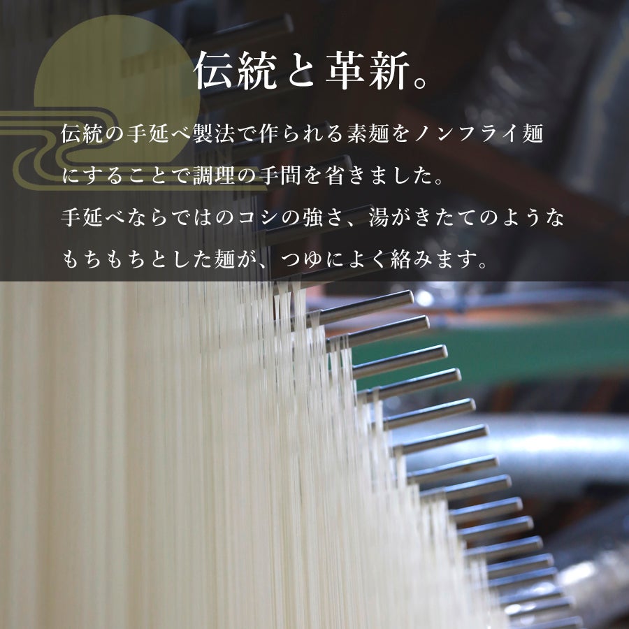 手延べそうめんを特殊冷熱加工により即席にゅうめんに仕立てました。具材には殻付きのはまぐりが2粒。上品な白だしにピリッと柚子七味をきかせてお楽しみください。